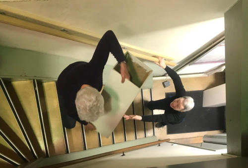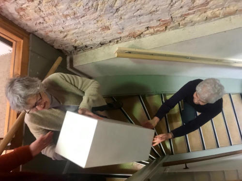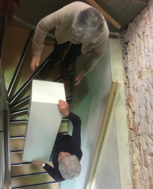 Teamwerk en plezier bij het vervoeren en plaatsen van de sokkels en het opstellen van de beelden