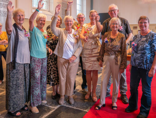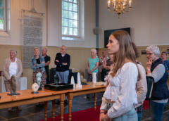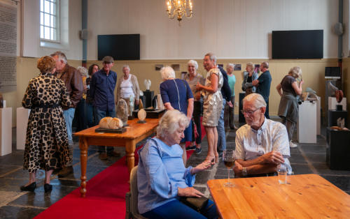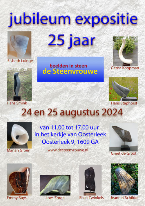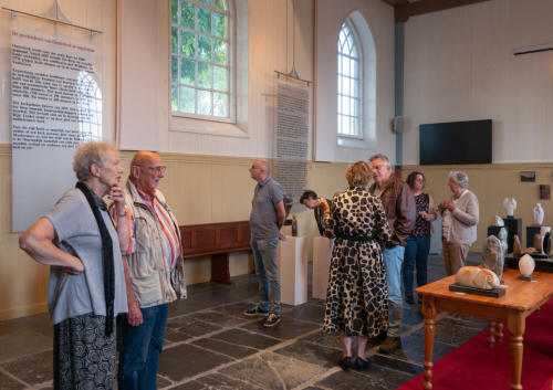 In het weekend van 24 en 25 augustus vierden wij ons 25-jarig jubileum in het prachtige kerkje in Oosterleek.We openden op de vrijdagavond de expositie met familie, vrienden en kennissen.Op zaterdagmorgen vóór de opening hadden we de oud-leden van de Steenvrouwe uitgenodigd om het feest met ons te vieren en met elkaar terug te kijken in de tijd.