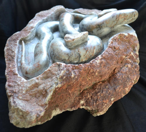 Ik ben circa 3 jaar bezig met beeldhouwen en heb ook zolang les bij Joop Hoillanders op de vrijdagavond. Omdat ik nog maar kort bezig ben heb ik nog niet alle mogelijkheden die er zijn op gebied van steenkeuze gehad. Maar serpentijn en albast vind ik prettig om mee te werken en ik wil graag later andere steensoorten ontdekken. Een idee voor een beeld komt bij mij niet vanzelf op mijn pad. Ik kijk naar voorbeelden waarvan ik denk dat ik zoiets zou kunnen (na)maken. Toen ik begon waren dit onderwerpen die met Japan te maken hebben. Japan is voor mij een heel interessant land vanwege mijn andere hobby -bonsai- , die ik reeds 30 jaar beoefen. In 2025 ben ik opgenomen in het team van De Steenvrouwe en wij werken samen in het atelier aan onze beelden. Ook thuis beschik ik over een blokhut waarin ik goed kan beeldhouwen.